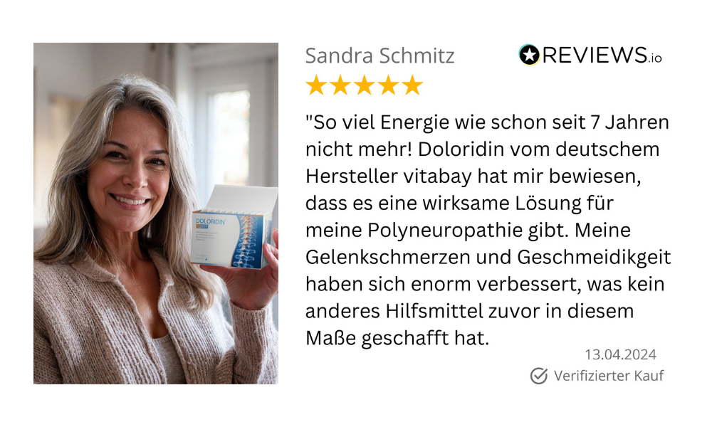 „Ich leide seit Jahren unter Ischias-Schmerzen und habe schon viele Medikamente ausprobiert, aber keines hat mir so geholfen wie Doloridin forte. Ich nehme es nun seit sechs Monaten und meine Symptome haben sich drastisch verbessert. Meine Schmerzen sind deutlich zurückgegangen, ich habe weniger Entzündungen, und meine Lebensqualität hat sich enorm gesteigert. Ich kann Doloridin jedem empfehlen, der mit Ischias-Schmerzen zu kämpfen hat.“ – Anna Schmitz